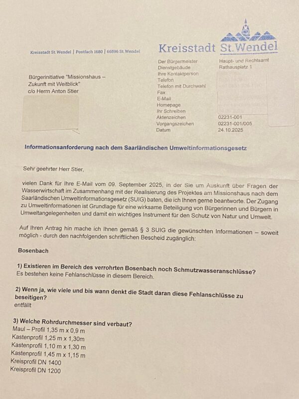 • Lesen Sie nach: Auf unserer News-Seite finden Sie die Anfragen zur Wasserwirtschaft, den Prüfbericht zu unseren Finanzen und unser Konzept — alles zum Nachlesen und Weitergeben. • Sprechen Sie darüber: Erzählen Sie im Verein, am Arbeitsplatz, in der Familie, warum Boden- und Hochwasserschutz keine theoretische Debatte sind, sondern Folgen für jeden von uns haben. • Machen Sie mit: Kommen Sie zu unseren Veranstaltungen und zur Stadtratssitzung, abonnieren Sie RADAR, teilen Sie unsere Beiträge in WhatsApp-Gruppen und auf Facebook und Instagram. Kleine Schritte verbreiten sich schnell in einer Stadt. • Unterstützen Sie uns: Wenn 200 Menschen 10 Euro geben, sichern wir ein weiteres Jahr Recherche, Rechtsprüfung und Öffentlichkeitsarbeit. Jede Spende hilft für St. Wendel Transparenz herzustellen. Spendenkonto Bernd Müller - Bürgerinitiative Missionshaus IBAN: DE37 5919 0000 0236 7660 12.