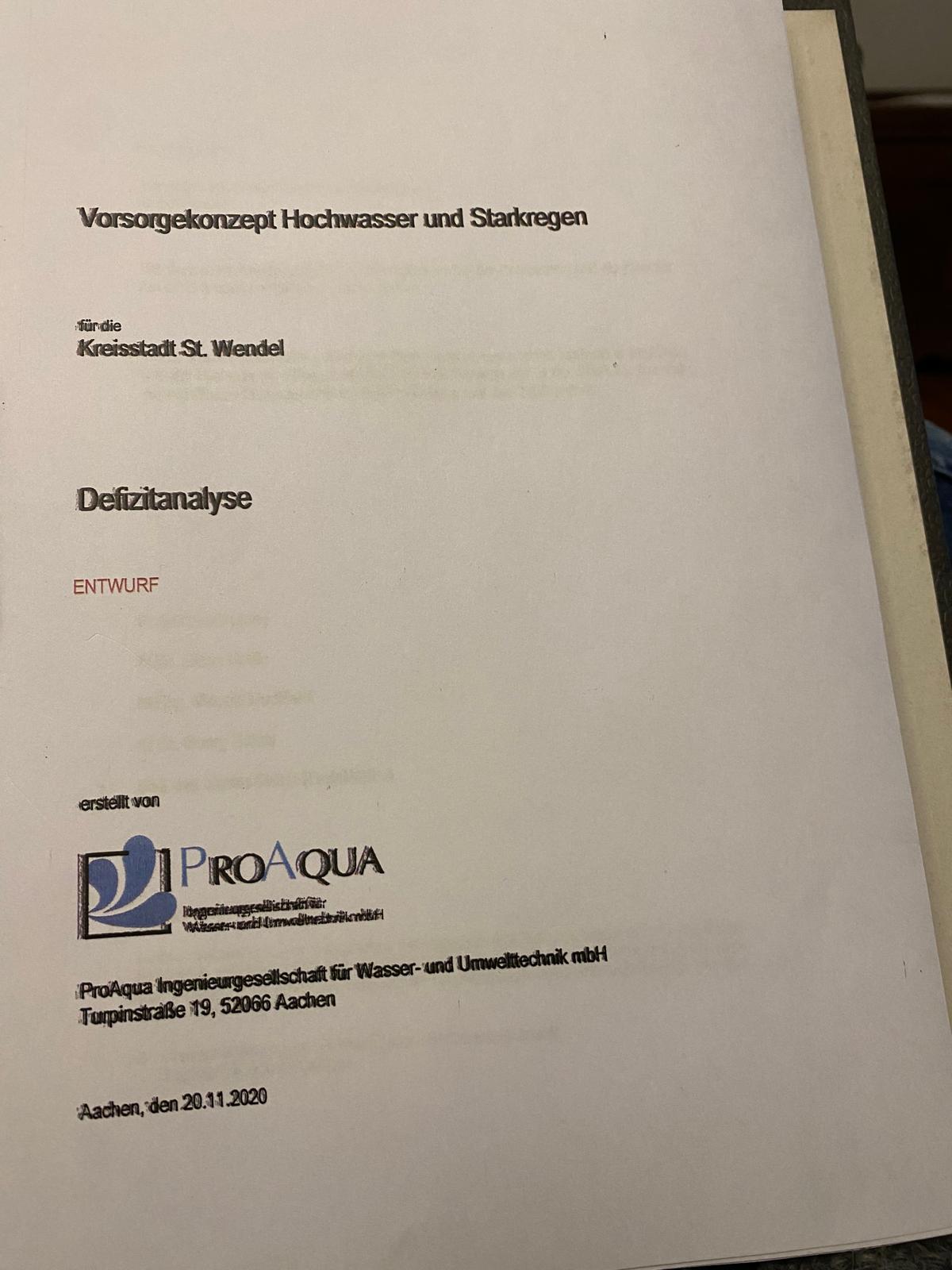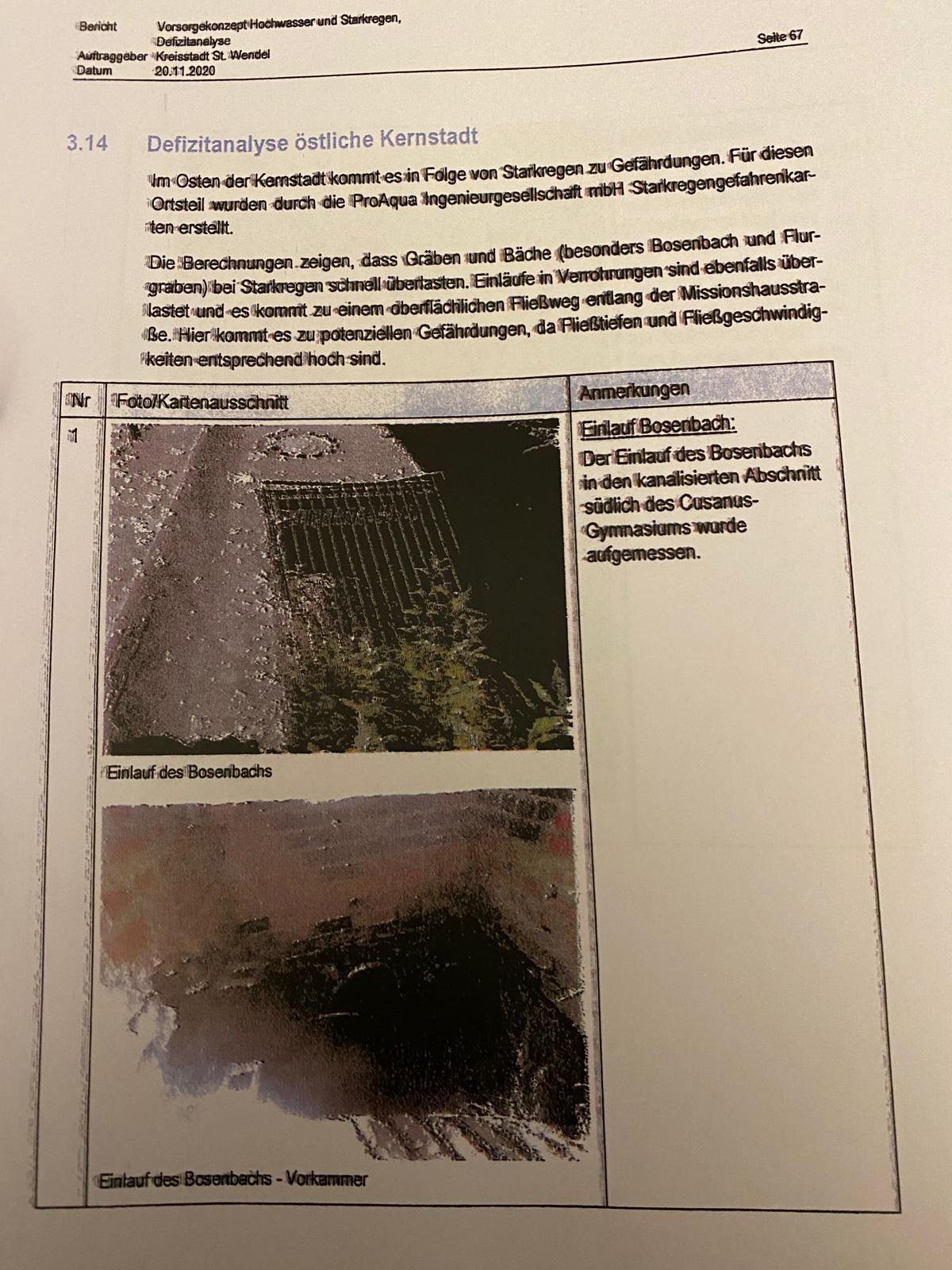 Anbei stellen wir zwei Seiten aus der „Defizitanalyse“ aus dem Vorsorgekonzept Hochwasser und Starkregen, erstellt von ProAqua Ingenieurgesellschaft für Wasser- und Umwelttechnik mbH am 20.11.2020 zur Verfügung, da im Schreiben darauf hingewiesen wird.